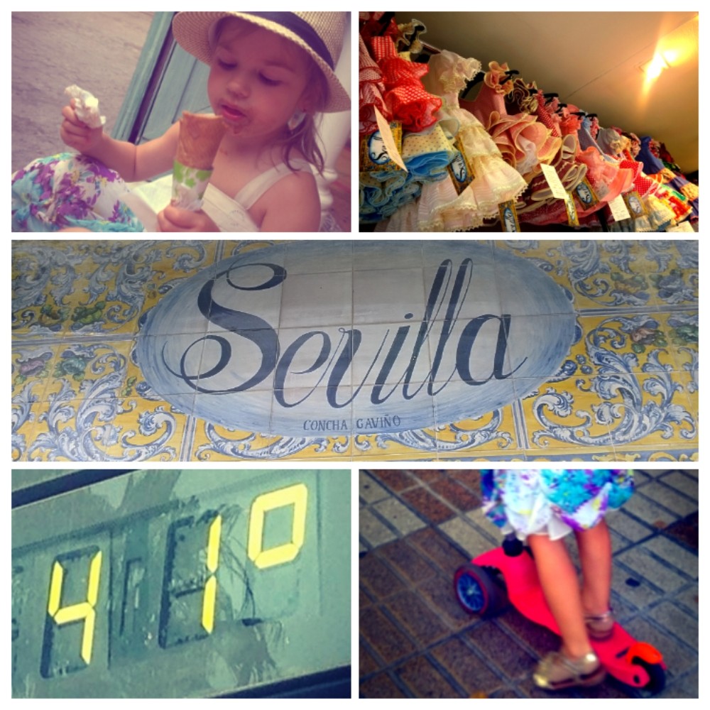 Sevillan liikenne on tunnetusti aivan kaameaa, joten paikalliset neuvoivat meitä jättämään auton keskustan ulkopuolelle Parque de los Principen lähettyville, josta olisi helppo napata metro keskustaan. Ajoimme kuitenkin jopa gps:n opastuksella kolme kertaa harhaan, joten loppujen lopuksi päädyimmekin juurikin keskustaan autollamme. No, saimme onneksi parkkipaikan parkkihallista maan alta, missä meitä oli vastassa kuumaa saunaa vastaava ilma. Ajattelin siinä vaiheessa, että emme tule selviytymään päivästä mutta maanpäällinen kuumuus ei ollutkaan yhtään niin kaameaa, vaikka mittarilukemat todellakin näyttivät pahimmillaan +43. En ole ikinä nähnyt vastaavia lukemia livenä. Lapset oli voideltu total sun blockilla, puettu pienimmät mahdolliset hellevaatteet ylle, pakattu mukaan hatut ja jokaiselle omat vesipullot. Lisäksi mukana kulki, kuten joka paikassa, potkulauta nelivuotiaallemme – silla kulkee paikassa kuin paikassa eikä väsymys ole iskenyt vielä kertaakaan.