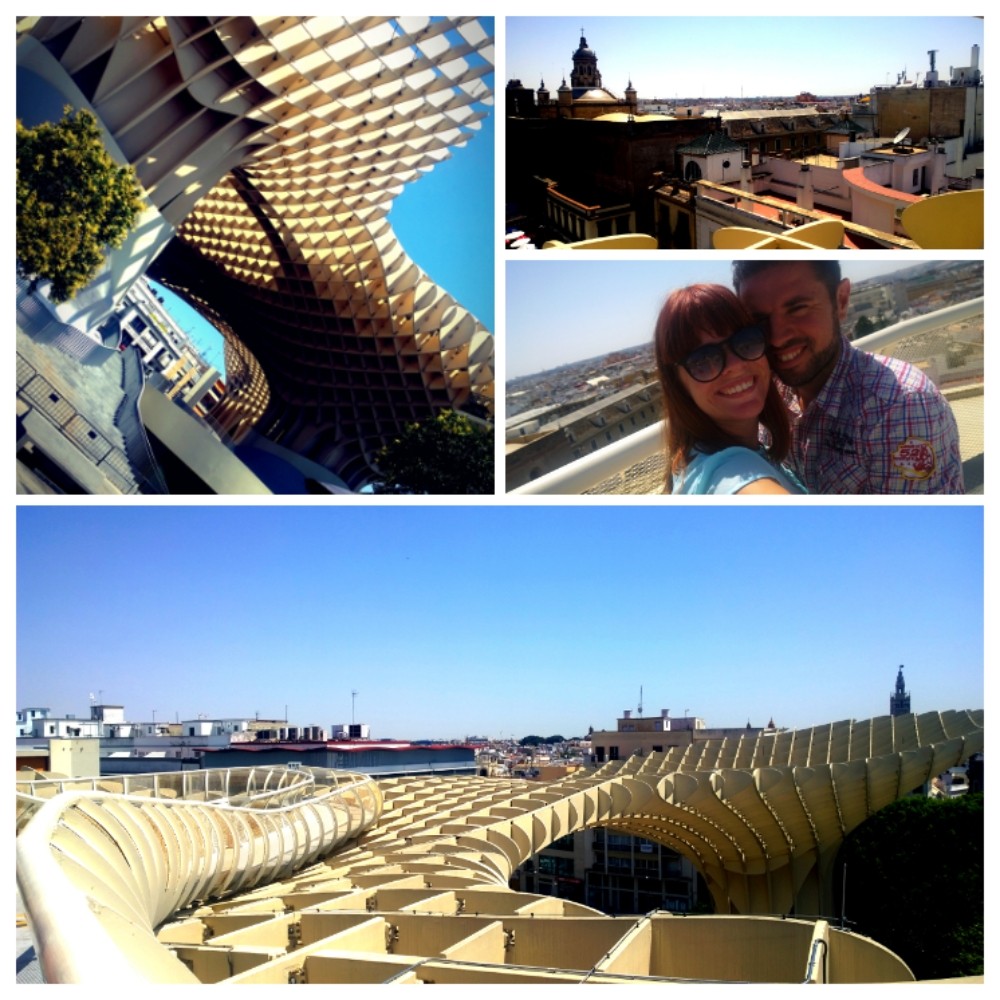 Lounaan jälkeen kapusimme kuuluisaan Parasoliin eli Setas de Sevillaan. Ylös pääsi vaunuilla kätevästi hissillä ja hinta oli suorastaan superhalpa. Kolme euroa per aikuinen ja siihen kuului ylhäällä juoma. Alle 12-vuotiaat lapset pääsivät ilmaiseksi. Katolta avautui upea panoramamaisema yli kaupungin. Upea kokemus, mutta kuumuus oli tyynellä ja korkealla peltisellä katolla liikaa. Vilvoitteluun yläkahvilassa kuluikin sitten toinen tunti.